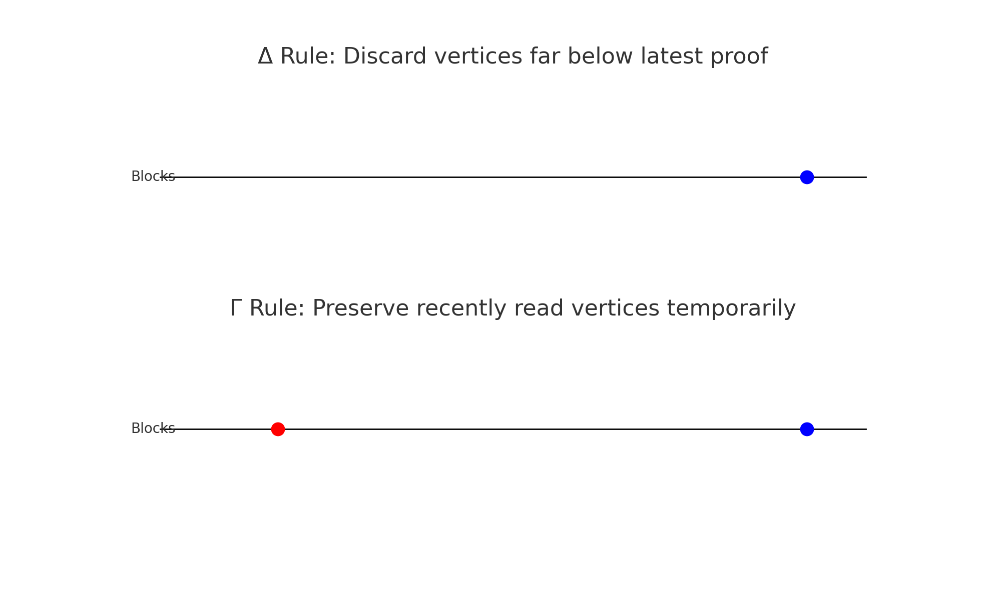 Let then v=(a,t,T) be a vertex, and \pi_a be the latest proof submitted for the account a, then v shouldbe discarded when T<T’-\Delta (\Delta=500 for example) where T’ denotes the “round” of the latest transaction proven by \pi_a.