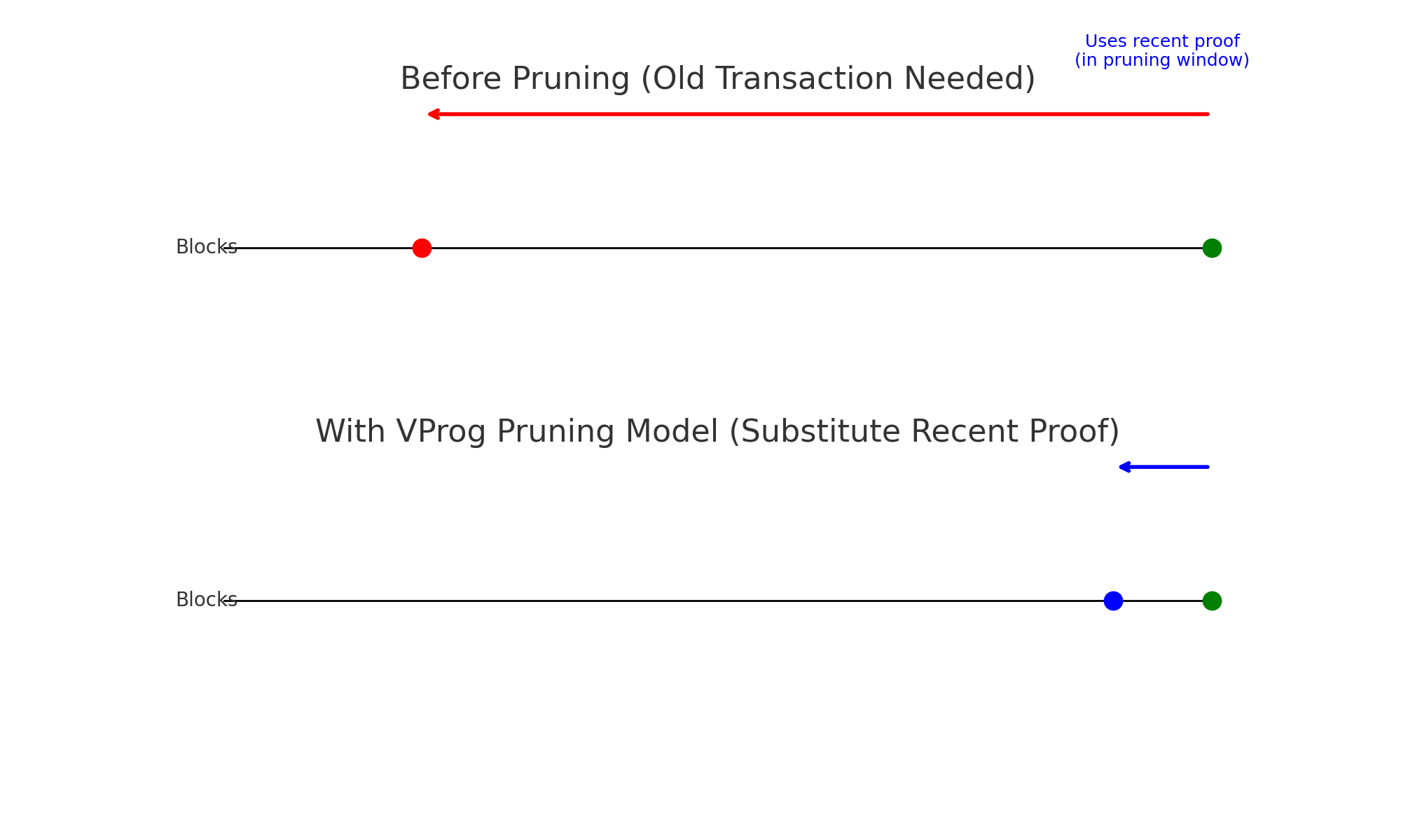 The above observation implies that in order to obtain the same functionality as a transaction x, one can equivalently provide witnesses for “later” vertices, so that the scope will be contained within the pruning period. This however requires these later vertices to be “proven”, but all this requires is that a recent proof of the corresponding account exists up to this pruning period. It is a reasonable requirement to expect that VProgs aiming to be composed with recent proofs, will provide proofs within the latest pruning period. It is remarked that under our design, a prover can always prove old data even after an extended period of inactivity (see On the design of based ZK rollups over Kaspa's UTXO-based DAG consensus)